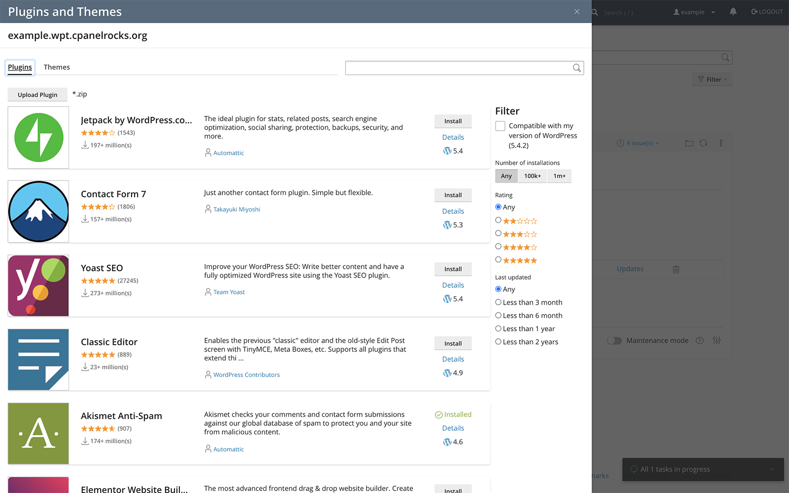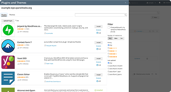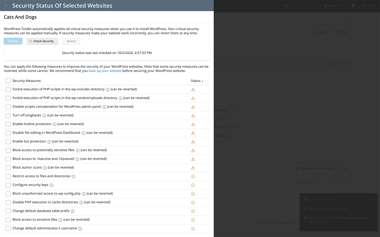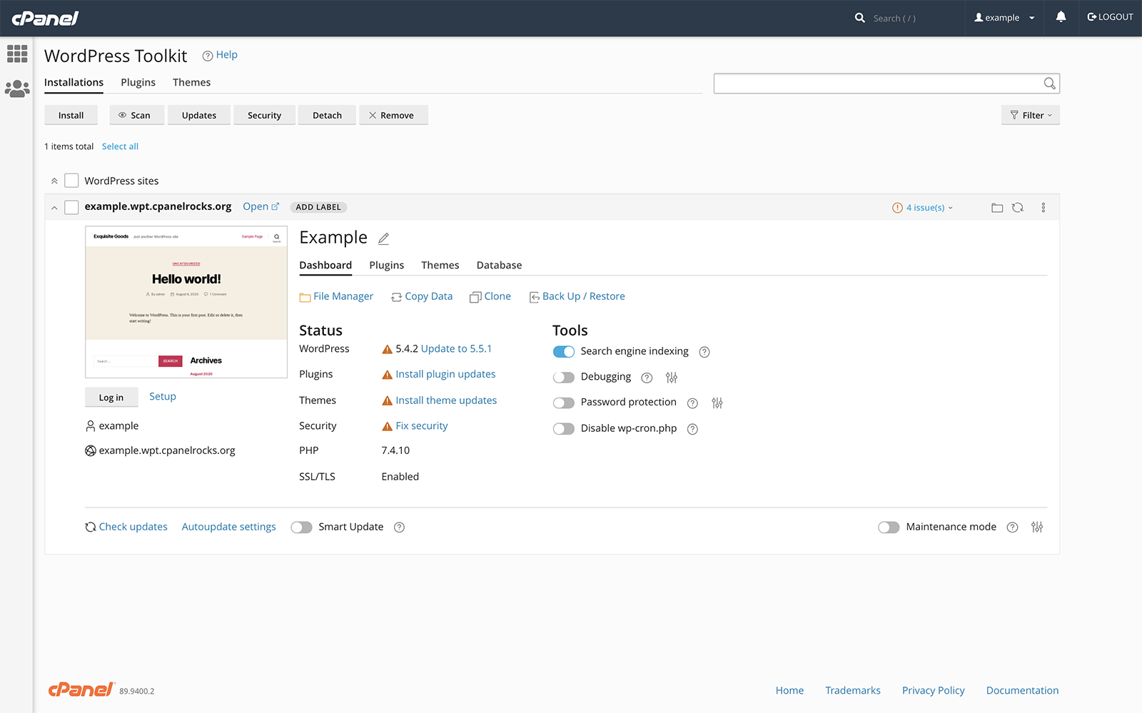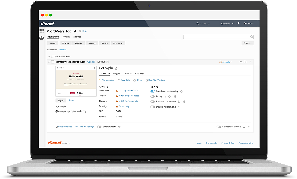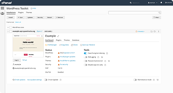 WP Toolkit Deluxe levert krachtige WordPress® plugin & themabeheer, beveiliging, automatisering, klonen en back-up/herstel allemaal vanaf één gebruiksvriendelijk dashboard.